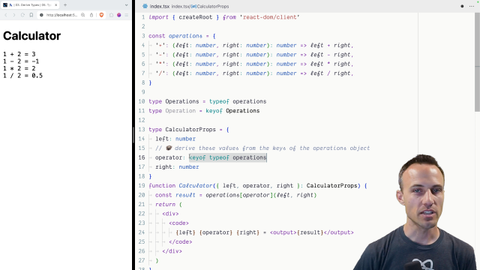 00:38 So this is basically just a short version of that. And so what that means is, if I hover over operator, we're gonna see those are the possible values, and if I do decide to add a exponentiation operator there, then I can 100% do it right there. TypeScript's not mad, I'm not mad, the browser's not mad,