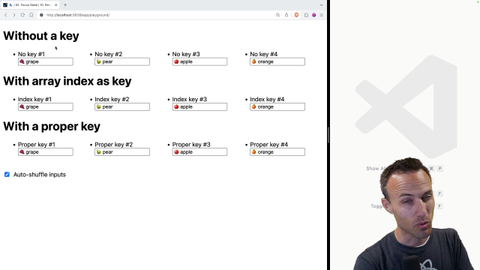 00:38 and so by using the index as a key, you're going to observe that it's actually operates the same as without a key and Then if you have a proper key than things work properly So I want you to focus on these different elements select some text start editing some text and see what the impact is on your
