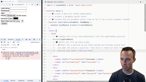00:00 All right. So we've got a bunch of stuff in here that react actually kind of does for us. So what I'm going to do is first do a little bit of a refactor. We're going to make a function called log form data. It accepts a form data object and then it's going to log. Move that up there. And then down here we have log form data.