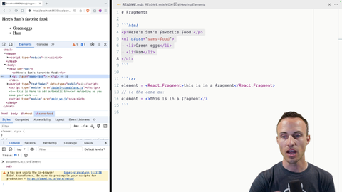 00:00 We need to talk about fragments. This is something that you use not super often, but it can be really useful if you have multiple elements that you need to be siblings of each other, and they also all need to be direct descendants of a particular element. This is pretty applicable for things like CSS Grid or Flexbox or something like that