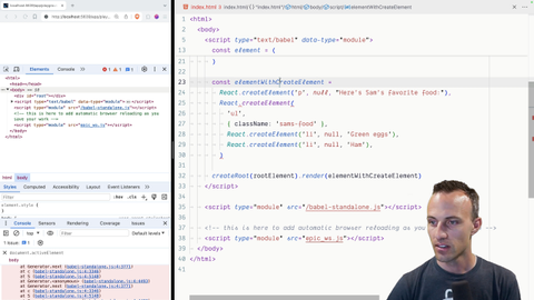 00:17 Why is Babel complaining that I can't compile this what is going on here? Well, let's let's take this to Out of JSX land into JavaScript land for a second might help us understand what the problem is so elements with Create elements and now we'll use our AI assistant to help us. Oh, no, come on