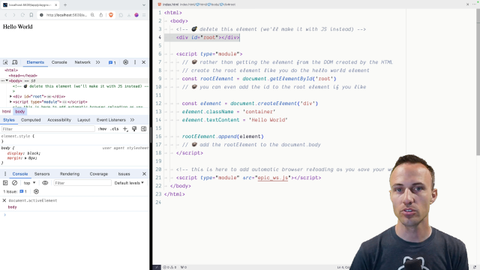 00:00 This next exercise is just to push the idea of working with the DOM a little bit further. Instead of having an HTML element for our root, we're going to generate that with JavaScript. Not a whole lot to do here, but just wanted to push things a little bit further than we have already. Have a good time. We'll see you when you're done.