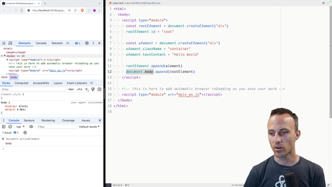 00:52 It may have an element that is appended to it, but it's not in the DOM right now And so we've got to say document dot body append root element So we've appended our element our hello world element to the root and now we're appending the root to the body Save that and we get our hello world
