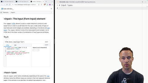 00:00 We're going to enhance our form a little bit here. Right now, we've just got the username. We want to add the password, age, photo, favorite color, start date, all of that stuff. And all of this you can find in the MDN Mozilla Developer Network web docs that will show you all the different types of inputs.