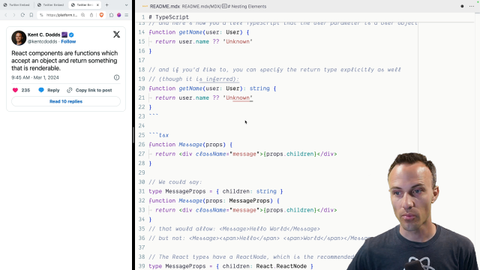 01:52 So TypeScript is a valuable tool. You definitely want to be using it. And again, as a reminder, React components are functions which accept an object and return something that is renderable. And so as far as TypeScript is concerned, you just type your components like they're functions. There's nothing really special about that.