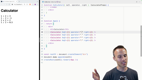 00:19 or multiply or divide. And with that now, we no longer have an error here because TypeScript knows, so I know what the operations is. It's these things. I know what the operator could possibly be. It's only those things and that matches up. So we don't have an error here anymore. And down here, we do get an error for that, which is nice. So if I get rid of that