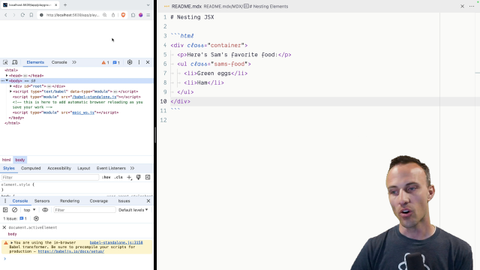 00:00 All right, remember when we did this Sam's favorite food, green eggs and ham thing with CreateElement? That was intellectually stimulating. Well, now what we're going to do is do this in JSX and see how much of an improvement we get out of doing nesting with JSX