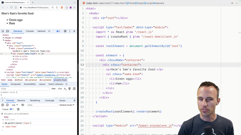 00:34 because the JSX is a lot more or JSX properties are a lot more similar to DOM properties than they are to HTML attributes. And so here it's saying invalid DOM property class. It's not talking about the HTML attributes. We're looking at DOM properties. So if we were to take a look at this you'll notice