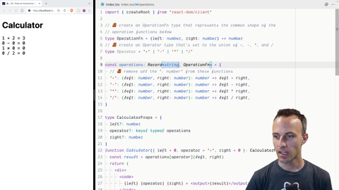 01:32 But we'll look at how to fix that here in a second. But we have successfully narrowed down our operations to just be a record of the possible operators to operation functions. And now, with that, we no longer have to have all of these types defined. Because TypeScript knows that the left has to be a number.