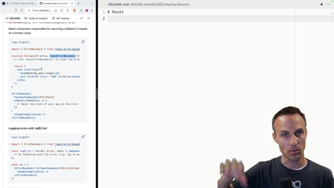 00:15 part of the props that your error fallback gets is this reset error boundary function you can stick that in a button and Call that at you know some when the user clicks that button, and it will reset the error boundary It's important for you to understand that React error boundary is not going to preserve the state of your component