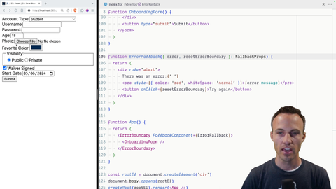 00:00 Alright, so when the user submits and it blows up, we don't give them any recourse, they have to hit refresh. We want to do something better. And so we're going to come over here, we'll say reset error boundary, pull that out of our props. And then we'll add a try again button that has an on click handler for resetting the error boundary. Try again.