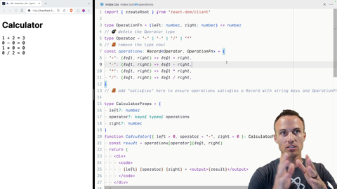 00:00 The problem that we're having right here is we're saying operations is this type, but what we can't, and that is very direct, like this is this thing, but what we can do is we can just say this operations object satisfies a type. So we can say, here's a wide type,
