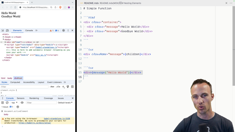 00:19 And so here's what it would look like if it was a little more generic. So it's got a class name message, but it also has this dynamic children. And so what if we made a function called message that allowed us to pass those children, right? That could be useful, especially if this was a lot more complicated and we wanted to reuse it all over the place.