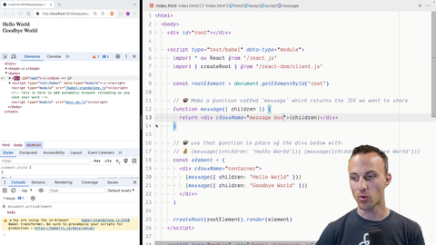00:00 Our objective here is to reduce the duplication. And the way that you reduce duplication in JavaScript is you make a function, and then you call that function. So we're going to make a function, a function called message. And it's going to accept some parameters.