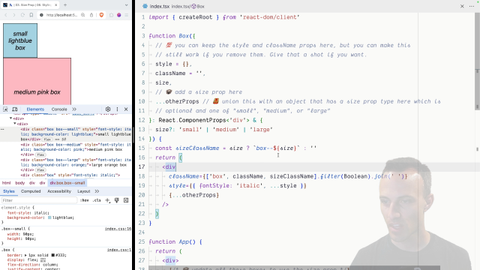 01:17 Here, let's get rid of our props there. We've got our box small, box medium, all of that. You'll notice we've got this double extra space and that's because the class name is not defined. It's defaulting to an empty string, which we don't really want actually, because we have a space on this side and a space on this side. Even if we trim it, that's not going to work.