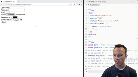 00:37 So we don't wanna put stuff in the URL. In addition, the photo, if we select a photo, we're just sending the name of the photo, of the image. But yeah, that is not going to work. We need to send all the binary data in there as well. So we've got two problems with the default behavior