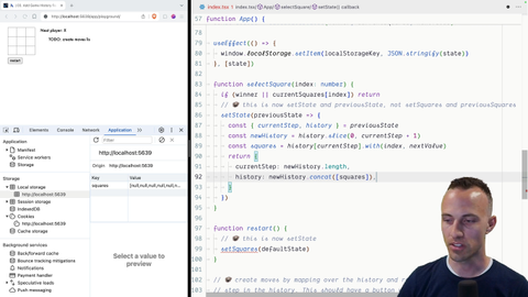 02:29 let's put it in local storage. Great, we're making our way down, this is all good. So now instead of set squares, this is going to be set state, and instead of previous squares, this is going to be previous state. With that, we need to do things a little bit differently.