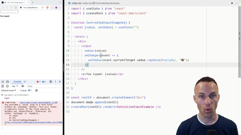 00:19 and we have our set value with our useState, and we're setting the value prop of the input to whatever the value of useState is. So if the user tries to type in here, they're not going to be able to change it because we're telling React, hey, I want the value to always be whatever the value of the state is. So if I get rid of this on change, we're going to actually get a warning here from React