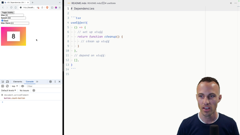 00:39 Remember in the last section, the last step, you saw a cleanup and then reinitialization every time we rerender. So anytime we make a state change that triggers this to rerender, we're going to get this being reset, which is not exactly optimal. It's not problematic really,