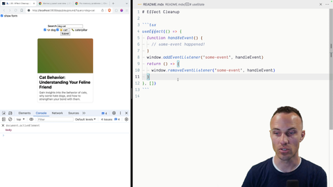 00:00 All right, so we've got a bit of a problem with our current solution with UseEffect, and that is we are not cleaning up properly. And this can cause minor problems, but it also can cause like pretty significant problems. So here with our UseEffect, we've got this callback,