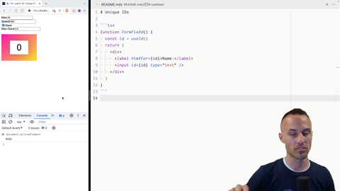 00:37 And so you have to make sure they each have a different ID. And it can be a pain when the actual ID, the value of the ID, doesn't matter. You could just generate it randomly. But the problem with generating it randomly is if you render it on the server as HTML, and then it shows up in the browser, and then you are going to hydrate it with React.