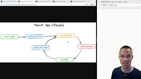 00:19 And you learned all about the React app lifecycle, initial render, creating the DOM, user interact, state changes, re-render, update the DOM. You know what this does and what this represents and how React manages to give you a nice declarative API where you don't have to think about time. Time still matters and data changing over time, that still matters,