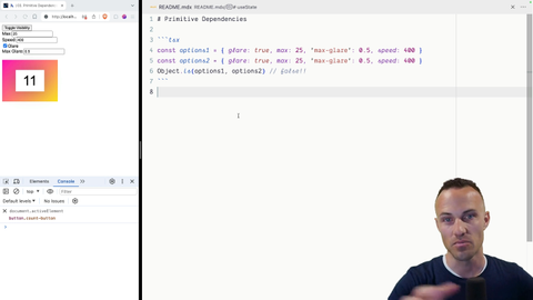 01:14 component, they are different objects between renders, and that's why we're getting reset. So, even though the properties are all the same, because we're getting a re-render here, we're creating a new object, and it ends up resetting. This is a really important thing for you to understand as you're working with the use effect dependency arrays, and when we get into use memo, and use callback, and all the