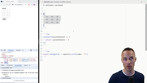 00:00 So, for this first step of the exercise, we're going to be actually calling setState and making it so when you click on these different buttons, they actually change between Xs and Os. Something important for you to understand about the way that this works is our state is going to be managed like this. So, it's just an array with nine entries.