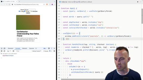 00:17 So like here, we type in cat, hit submit, everything's working fine, I hit back, and now we need to get that query param again and set the query value to that so that it no longer includes cat, right? That's all that we're trying to do here. Pretty straightforward.