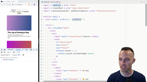 01:48 of the input. If I type something in there and we look at the value, that's going to be the current value. So we get the current value out of that input, we put it into the setQuery state, and then that query can then be used to filter down the different posts that are displaying here.