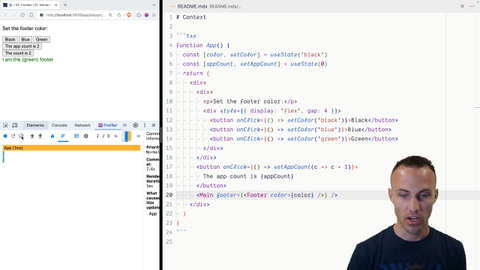 00:00 So, we've refactored things a little bit. Now we have the color chooser, we have the app count, and then we have the general count. So, this is the count that's inside the main component. And here we can see the refactoring. We've got our footer as an element and everything.