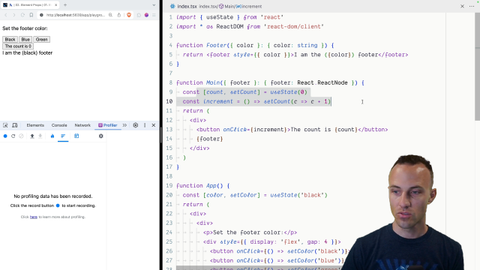 01:28 The props are unchanged. And so for that reason, incrementing the count should not affect the footer. So let's try that out. We're going to hit record. We're going to increment the count, and then we'll change the color. And it looks like it's all still operating the way it should. On that first count increment, we only changed the main. We only re-rendered main.