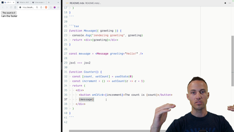 01:08 message is now a variable that's assigned to the message component, then we can interpolate that message component inside of the counter. What's interesting then is that the React element that's created via this JSX, that React.createElement call,