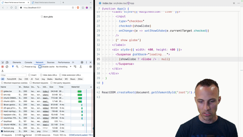 00:16 and now we have a suspenseful globe. If we render just the globe as it is without wrapping it in suspense then we'll have kind of an interesting experience here. Wow that happened really fast here. We're going to have to throttle our network here a little bit