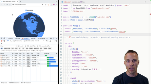00:00 So, what we're going to do is get our transition. So, isTransitionPending and startTransition. That's going to come from useTransition, not useState, AI assistance. You got to always review their code, and we're going to do the HANA 100 useSpinDelay, but here in a second, we'll
