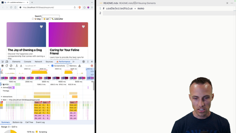 02:09 But this Performance DevTool is going to be the thing that we're going to notice the biggest impact on our performance. Especially when we delete the dog, this will be pretty interesting right here as well. So this will look very different once you added useDeferredValue. And it's thanks to React's concurrent rendering and how it can say, OK, I'm doing some work.