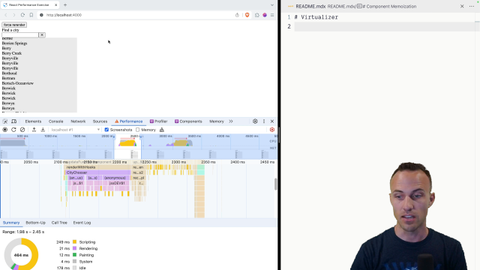 00:34 Which is an outrageous amount of cities and so react even just in checking Do you need to re-render? Do you need to re-render? Do you need to render all of that? Takes a really long time and then the the browser updating and handling all those dom nodes also is going to be problematic