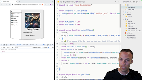 00:00 So we've got a bit of a problem here and that is if we have one of these Data requests that we're making so like the search ships or the ship details if one of those is slow Then the entire app experience is going to be slow. So our Kelly the co-worker