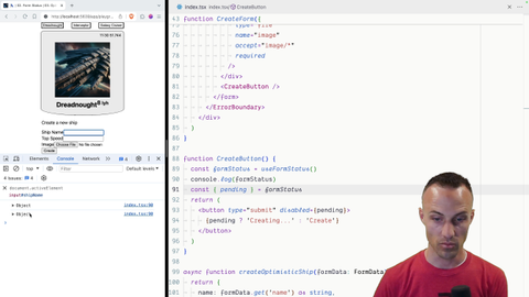 00:00 So we want to take this button and make it a little fancy and reference the form status. And so we're going to create a component because we can't do it right there in the same component that's rendering the form. So we're going to make our function and this is going to be our create button. We're going to get our pending state from.