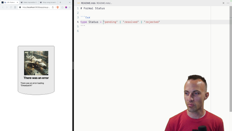 00:18 So your status is going to be either pending, resolved, or rejected. We'll start it out as pending. And this lines up nicely with a blog post that I wrote titled Make Impossible States Impossible that you can check out and stop using is loading Booleans. So feel free to take a look at those as you work through this exercise.