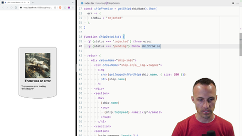 00:22 just checking for the existence of certain variables. So status is rejected. Then we'll throw the error. And if the status is pending then we'll throw the ship promise. Otherwise it actually doesn't matter that it's resolved. We'll just continue because that's the only other