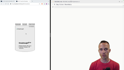 00:37 is we're going to leverage the fact that error boundaries can be local and nested and everything. We're going to put an error boundary right around the image, so that way we can do whatever we want to with our fallback. Now, the interesting thing here is that maybe you could have a special image that you display as a fallback,