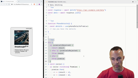 00:00 Let's talk about data fetching in React. So when you're data fetching in a web application, typically, you're going to use fetch. You'll pass some URL you want to fetch the data from, you get a response from that, and then you can stream that response, or you can get the JSON, whatever that response is.