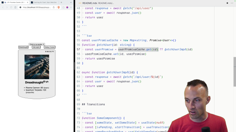 00:58 fetch user is going to be called again. Now, React actually notices this and it will give you a warning telling you what's going on. But yeah, you don't want to have this problem at all. Not a good thing. So how do we solve this problem? We solve it by caching.