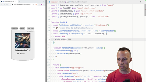 00:00 All right, let's take care of this flash of pending state. You can control this a little bit if you come down here. So you could play around with the delay, like what if I want it to take 200 milliseconds? Then that's how long it's gonna take for each one of these. And so now it's not quite so much of a flash,