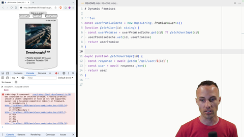 00:16 compatible library for creating promises during render, but we're actually not creating promises during render, and this is a bit of a misnomer because I don't think anybody else is. Well, we're creating one promise during render but then caching it. So I guess, yeah, that warning works. That's okay, React.