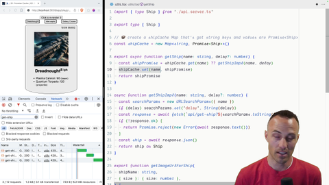 01:30 Promise is equal to the ship cache or calling get ship impl with the name and the delay. If it doesn't exist in the cache already, then we'll trigger the fetch request and get the promise from that. Then we'll update the ship cache to set