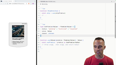 00:35 it will give you the right mental model for working with the use hook and suspense and error boundaries. And so that's why we're doing it. So we'll have our status and value and reason tacked onto that. And then to get your use function started, this is going to be a generic function that takes a value, but that's going to just be inferred by whatever the given promise resolves